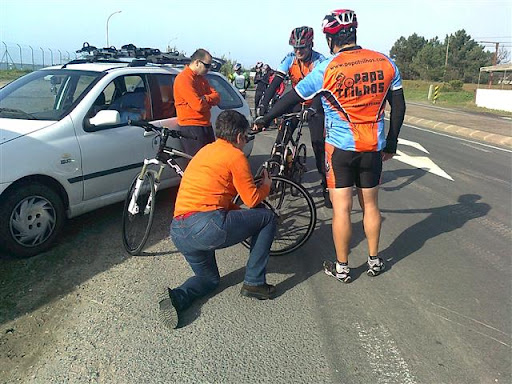 Aqui comemos, graças á Gina e ao Ivo, o melhor frango assado da minha vida (e olhem que já comi...). Troca de câmara de ar outra vez e afinação de roda pois vinha a travar desde á muitos kms. (Aqui ficou nova agora sim!). Paragem para apreciar a malta que andava a competir e a convidar "pró" lanche quem precisasse...