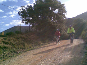 Entre os olivais da região, fomos acumulando quilómetros. Os estradões eram bastante agradáveis, num sobe e desce constante e com algumas pedras soltas à mistura. A primeira situação da manhã é protagonizada pelo Rikybike San que efectuou um mergulho encarpado com rotação sobre o eixo frontal da bike e aterragem... no chão! A queda, meio aparatosa resultou em pouco mais que isso. A protecção à bike foi perfeita e somente eram visíveis uns arranhões nas pernas. Nada que o orgulho não resolva!