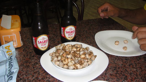 O sol já não se via, mas o seu reflexo no céu era suficiente para nos guiar sem grandes trabalhos. A 1ª paragem estava à vista. Depois da descida que habitualmente subimos, fizemos uma manobra de estacionamento e pedimos o cardápio. Estávamos no Brasil Burguer e o nosso pedido de choco frito estava feito. Enquanto esperávamos, e como somos impacientes (rebeldias do nosso estômago!!!), decidimos degustar uns caracóis devidamente acompanhados, não de brasileiras, mas de umas lourinhas.