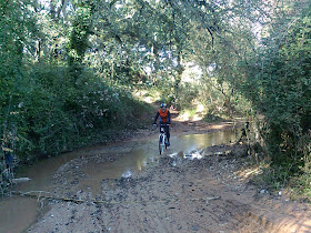 Aqui, optou-se por meia dúzia de quilómetros em asfalto, onde entramos depois para a zona do Xico das Saias. Quando íamos mesmo a chegar ao cruzamento para "papar" este trilho, eis que continuámos em frente e passámos-lhe ao lado, onde tomámos a direcção da Comenda. Neste troço, foi possível desfrutar um pouco (pouquinho) de BTT mais radical, pelo menos para os que decidiram fazer umas passagens por umas poças que mais pareciam lagos, onde os pezinhos tinham de mergulhar na laminha. Após os primeiros terem usufruído de uns belos banhos de lama para os pés - dizem que faz rejuvenescer - surgiram alguns Papa Trilhos que não apresentavam sinais exteriores de sujidade, pelo que se conclui que estes caminhos tinham alternativas.