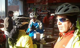 De sobretudos, meias duplas e outros acessórios anti-frio, iniciámos as nossas pedaladas até à Qta do Conde para completar o grupo. Nas bombas de gasolina viam-se umas bikes, mas pedalantes nem vê-los... estavam todos lá dentro a aquecerem-se em grupo (podem dar a interpretação que quiserem!). Os recém-chegados, invejosos, não resistiram e também entraram...