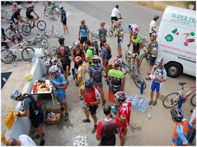 Depois de comer umas fatias de melão, metemos pés no pedal, porque ainda faltava uns kms. Mais à frente houve outro abastecimento onde estava o João do BTT-TV. Mais umas fatias e águas, pois o sol escaldava, mas já estávamos perto. Mais uma dúzia kms e tínhamos a meta à vista onde estava a nossa claque a apoiar. Só faltava o Cajó e ficámos à espera. Passado um tempo aparece com o cromado todo riscado- tinha caído e vinha mal tratado, mas bem disposto.