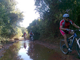 E assim fomos na direcção da estrada da coca cola, não sem antes o “Puro Prazer “ (leia-se, Mimosa San) fazer das suas e romper a camisinha de borracha do pneu traseiro. Feita a reparação, subimos até ao estradão do cai de costas. Desta vez todos fizemos o dito, a descer pois então!!!; fio dental, oliveiras, até à estrada nacional, direcção Comenda, mas não seguimos por lá, voltámos para a direita atravessando a ribeira ainda sem água.