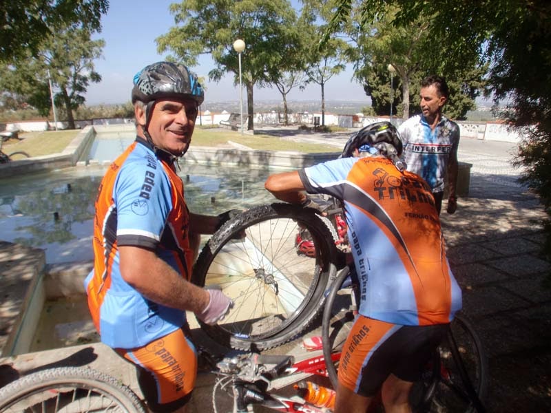 Mas ainda havia outra cereja para o bolo: as antenas de Palmela! E lá fomos nós! Nesta altura, já estávamos a consumir directamente da camada adiposa dos nossos próprios corpos. Aqui, comecei a ficar claramente em vantagem , porque tenho para aqui material desse que dá para fazer a volta a Portugal, incluindo Açores e Madeira.... E como não há duas sem três: A Cobra!!! Ai essa malvada, que lá tivemos de dominar, antes de um reabastecimento e análise de suspeitas de furos, por parte do nosso Kimbikes. Após longos Km com a suspeita que eventualmente, poderia haver a probabilidade de um hipotético furo, lá colocou a roda dentro de água e constatou que saiam bolhinhas: Significava que a probabilidade das hipóteses se transformavam agora em Tese, e lá se formaram as equipas de um a trabalhar e 20 a ver... desculpem... a ajudar!